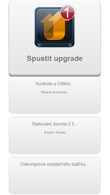 Joomlu máte ve verzi 1.5.25? Hosting je vhodný pro Joomla 2.5? PHP v5.2.4+, MySQL v5.0.4+, Curl module povolen, System - Mootools Upgrade plugin povolen, prohlížeč podporuje Javascript/jQuery?