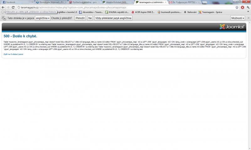 v databázi chybí tabulky pro Phoca Maps - někde nastala chyba, kde netuším, protože SQL dotazy provádí přímo Joomla!