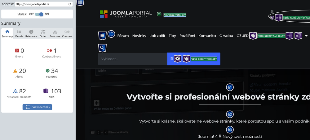 Ještě jsem mírně snížil jas textu, ale jen tak, aby web plnil pravidla přístupnosti. Ten jeden error je svg button "Close"