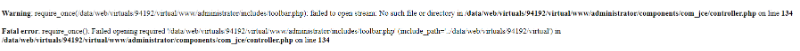Fatal error: require_once(): Failed opening required '/data/web/virtuals/94192/virtual/www/administrator/includes/toolbar.php' (include_path='.:/data/web/virtuals/94192/virtual') in /data/web/virtuals/94192/virtual/www/administrator/components/com_jce/controller.php on line 134