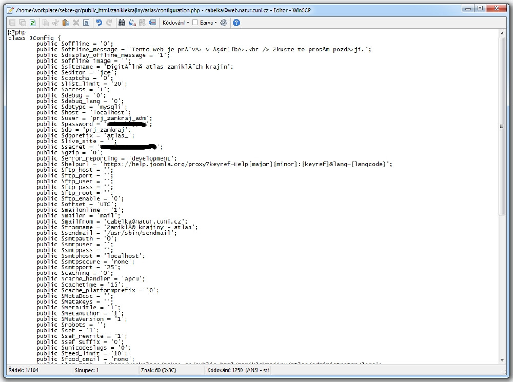 Ten screen jsem měl otevřený pouze v editoru, který nebyl přepnutý na správné zobrazení UTF-8. Soubor configuration.php v UTF-8 je. A ještě jsem ho pro jistotu znovu přeuložil v UTF-8.