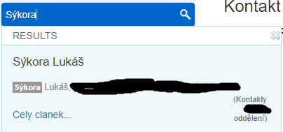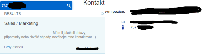 Druhý problém, který bych potřeboval vyřešit je, že při vyhledávání uživatelů vyběhnou výsledky hledání, kde jako malý nadpis je jméno hledané osoby a u toho menším textem název jeho pracovní pozice. I zde bych potřeboval, aby se rovnou zobrazilo telefonní číslo, aby když budu někoho hledat tak aby jsem ho nemusel rozklikávat, ale viděl jsem jeho telefon ihned. Adresu na stránku sem dát nemohu, jelikož se jedná o interní web. Proto přikládám alespoň screeny.