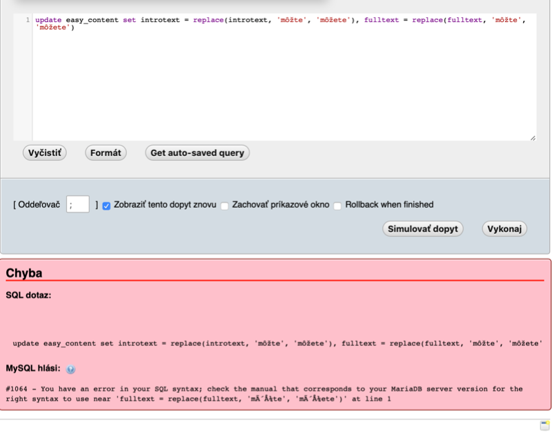 Ja som prikaz zadal ale v databaze, cize nie po kliknuti ann tabulku easy_content. Ked kliknem na tabulku a az nasledne na SQL, tak mam uz v poli pre prikaz napisane: SELECT * FROM `easy_content` WHERE 1