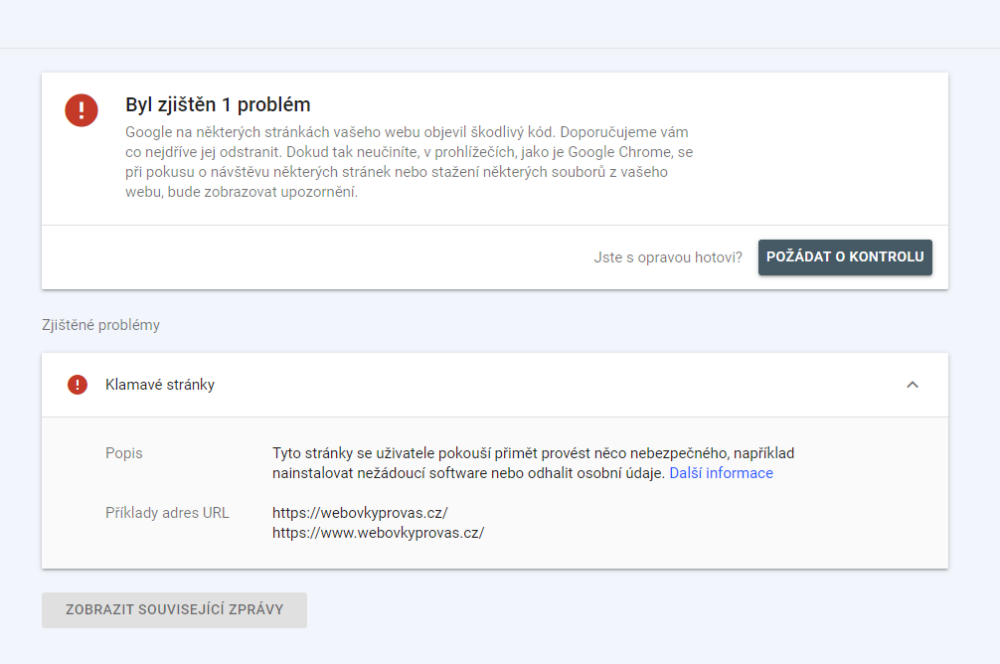 - google search console stále hlásí: www.webovkyprovas [.]cz/ byl zjištěn sociálně inženýrský obsah