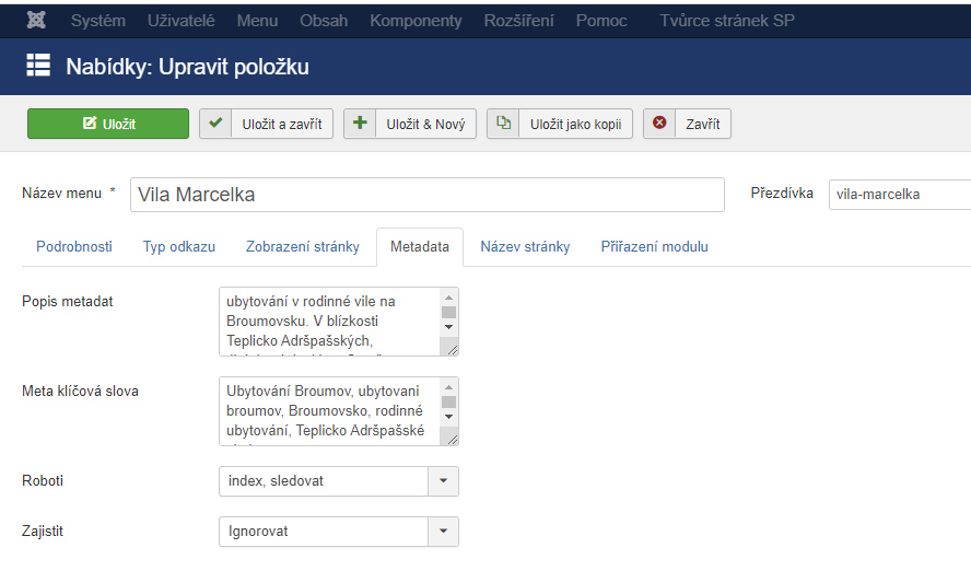 Do Keywords stránek a do description stránek si naroubujte také ty požadované řetězce "Ubytování Broumov" a "Vila Marcelka"!