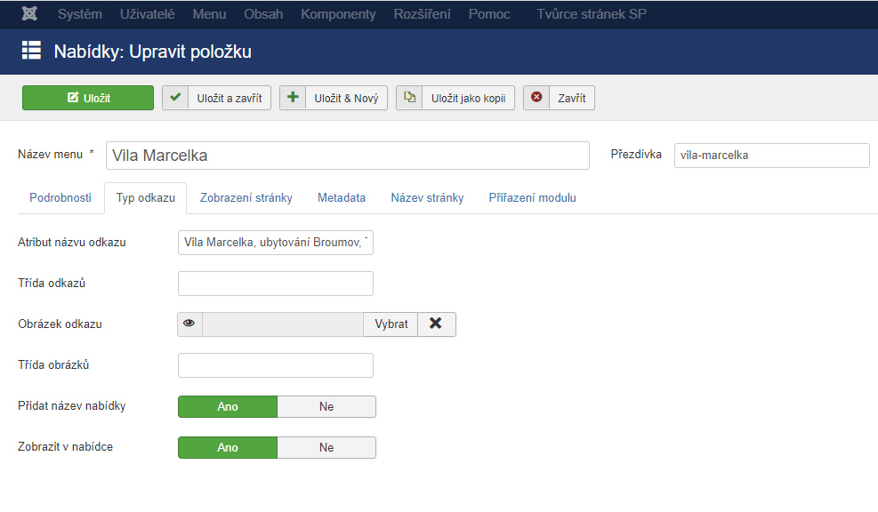 Titulek okna prohlížeče - Volitelný text, který bude použit jako titulek stránky prohlížeče. Ponecháte-li prázdné, bude jako titulek stránky prohlížeče použit název položky nabídky.