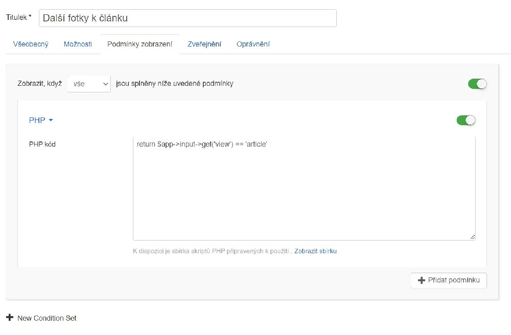 - u galerie, kterou chci mít pod článkem, jsem ale potřeboval, aby se nezobrazovala ve výpisu blogu pokud je u článků tlačítko "Číst více..." (to je to, co jsem tu řešil) a pak jsem to našel jako první v dokumentaci u tohoto pluginu (jsem vůl, že nečtu...). Stačí dát u daného pole podmínku s PHP kódem return $app->input->get('view') == 'article' což zajistí, že se galerie ukáže teprve, až dám číst celý článek: