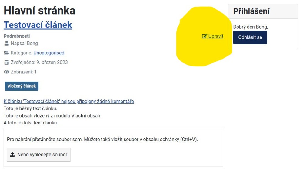 Úpravy článků normálně fungují. Stačí se přihlásit ve frontendu. U článku pak máte tlačítko UPRAVIT (samozřejmě jen pokud máte oprávnění).