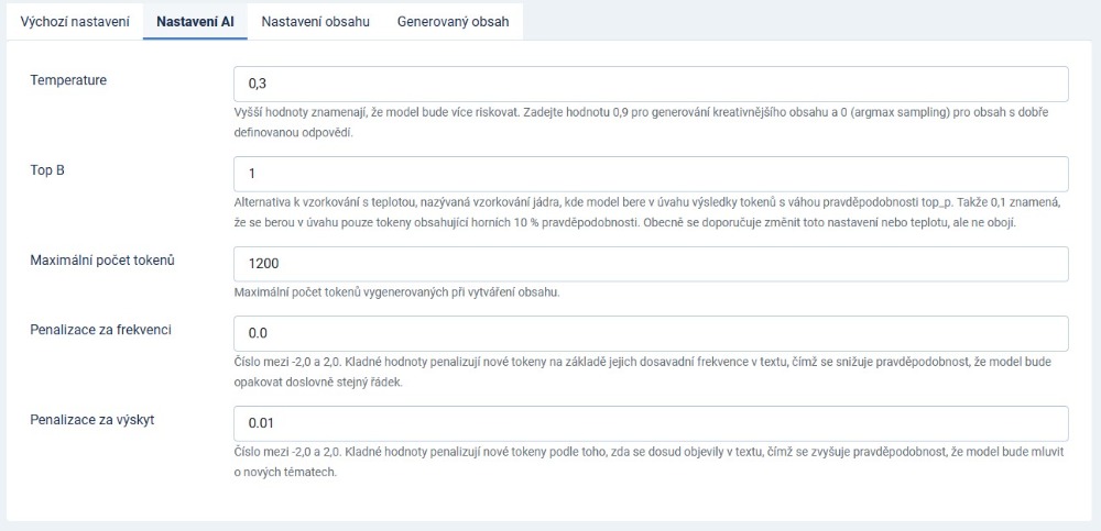 Pro Temperature jsem někde viděl hezký překlad "Míra nahodilosti", parametr Top B by měl být správně Top P, možná něco jako "Koeficient pravděpodobnosti", "Koeficient nahodilosti"?