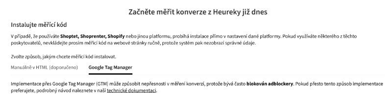 Implementace přes Google Tag Manager (GTM) může způsobit nepřesnosti v měření konverzí, protože bývá často blokován adblockery.