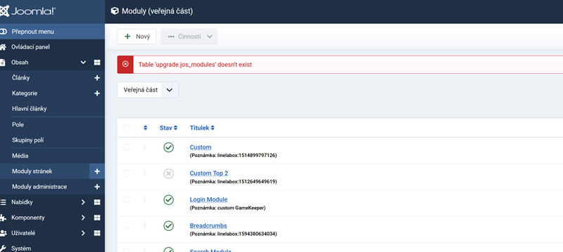 chybová hláška v sekci modulů po aktualizaci J3 na J4