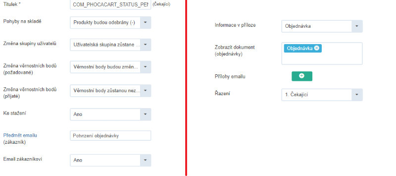 To, jestli se pošle objednávka, doklad nebo faktura, záleží v Phoca Cart na order statusu: