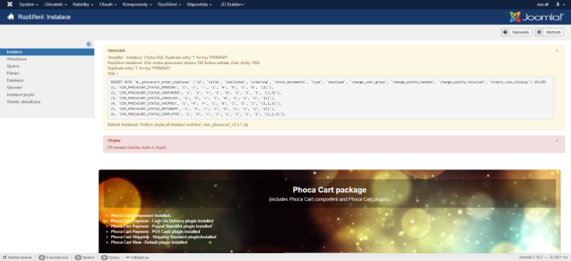 Balíček Instalovat: Došlo k chybě při instalaci rozšíření: com_phocacart_v3.5.7.zip