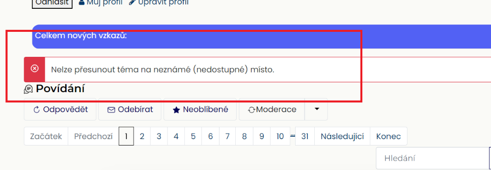 Zkoušel jsem to s administrátorským profilem a to ať už měl navíc globálního moderátora nebo ne. Přesunout celé téma do jiné kategorie lze. Ta chybná hláška se objevuje jen když chci jednotlivý příspěvek přemístit mezi tématy. Z jedné diskuze do jiné.