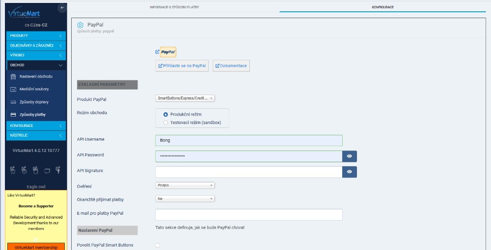 Potřebovala bych poradit, jak nastavit platební metodu PayPal. Mám na PayPal Bussines účet, mám nastavené a vygenerované API a mám tedy ID klienta a Tajný kód. Jenže všechny platební metody na Virtuemart pro Pay Pal toto nechtějí, ale chtějí nějaké přihlašovací údaje a to: Uživatelské jméno API, Heslo API a Podpis API. Ať dělám, co dělám, toto nejsem schopna na PayPal účtu nijak nastavit nebo vygenerovat. Generuje se vždy jen ID klienta a tajný kód. Tak jak mám nastavit platby kartou přes Pay Pal, když Pay Pal generuje něco jiného než požaduje nastavení v VirtueMart? Už to dělám několik dnů, proštrachala jsem svůj účett PayPal skrznaskrz, ale takové údaje z toho prostě nejsem schopna získat. Už jsem používala nějaké aplikace, kde se platilo přes PaPal kartou a tam se právě vkládalo to, co již mám vygenerované. Ale ve Virtuemart je prostě heslo, jméno a podpis, a to neseženu ať dělám, co dělám.