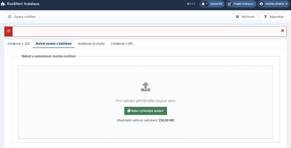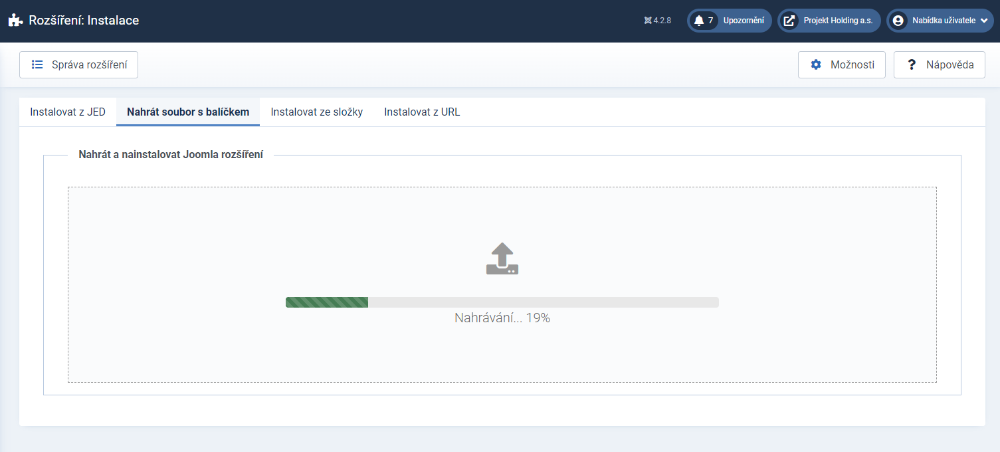 Instalace jakéhokoliv rozšíření provádím pouze přez rozhraní Joomly v její administraci.