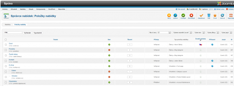 snažíme se s kamarádem přeložit web www.vretenovesekacky.cz do němčiny, ale nějak pořád nefunguje modul "Language switcher". Aktivovali jsme plugin Language Filtr a nainstalovali němčinu. Dále jsme vytvořili kategorie pro český a německý obsah. Poté bylo vytvořeno menu pro CZ tak pro DE a pro VŠE. Přesně podle návodů. V každém hlavním menu pro daný jazyk je zvolena hlavní stránka (symbol vlajky). Pokud nyní přejdu na adresu www.vretenovesekacky.cz/de/ opravdu se zobrazí hlavní stránka pro němčinu pokud zadám www.vretenovesekacky.cz/cs/ zobrazí se hlavní stránka pro češtinu. Teď k problému, když je přidán modul ,,Language Switcher", který zobrazuji úplně dole v patičce na webu (ikony vlajek). Odkazy na vlajkách vůbec nezmění jazyk, navíc je v odkazu nějaká adresa ("strana-5" nebo "strana-6"). Nedokáže mi někdo vystvětlit proč to funguje takhle špatně? Do příloh jsem vložil nějaké screeny z administrace. Děkuji za Vaše reakce..MB