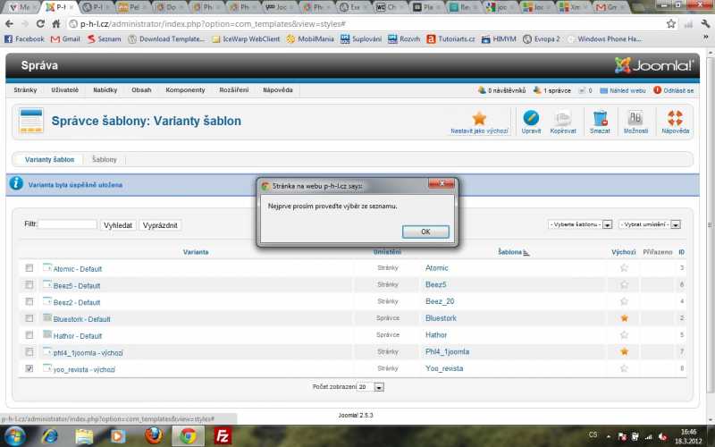 mám problém. Aktualizoval jsem Joomlu 1.7.3 na Joomlu 2.5.3. Pomocí aktualizačního nástroje ve správci rozšíření. Po aktualizaci se vše tvářilo v pořádku, ale nyní nastal problém s tím že když si nastavit nějakou šablonu jako výchozí tak to nejde. Když zaškrtnu nějakou šablonu a kliknu na tlačítko "Nastavit jako výchozí" Vypíše mi Joomla hlášku "Nejprve proveďte výběr ze seznamu". Ale to je blbost protože já už mám provedený výběr ze senamu.