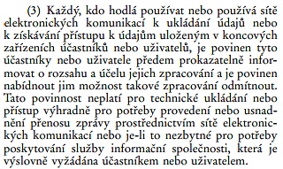Jen cookies (imho) "Zákon 127/2005 Sb. o elektronických komunikacích,... §89, odst. 3." neřeší - dotýká se i dočasných souborů, které (podle mě) spadají tak jako i sušenky pod "výjimku", citují: "... Tato povinnost neplatí pro technické ukládání ..."