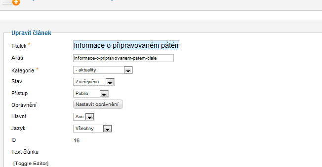 Pokud máte hlavní stránku typu blog hlavní stránky, všem článkům, které mají být zobrazeny nastavíte Hlavní (dříve Titulní strana).