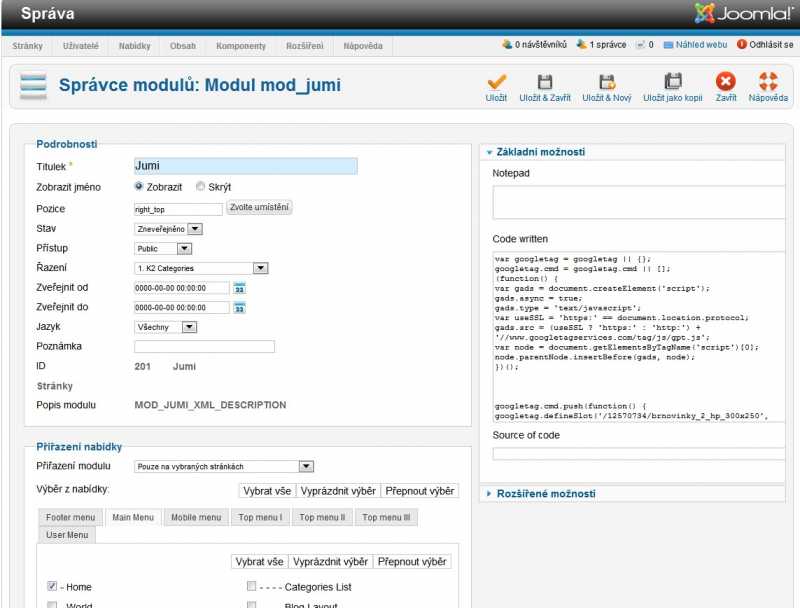 Vůbec netrvám na JUMI, cílem je rozchodit DFP. Jelikož bude reklam více, rád bych to řešil modulem, ne tvrdým zásahem do kódu.
