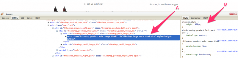 rád bych se zeptal na možnost, jak se dá dopátrat soubor, který potřebuji editovat. Ve Firebagu jsem si vyhledal místo pro úpravu výšky prvku (style="height: 520px") ale nevím teď, kde ho mám hledat. V jiných případech vidím v pravém okně Firebagu odkaz na daný soubor ela v tomto případě tento odkaz chybí (viz obrázek a šipka B)