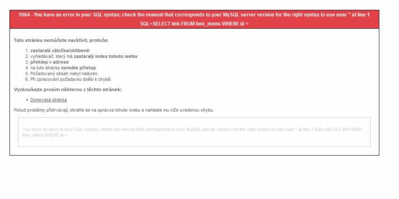 You have an error in your SQL syntax; check the manual that corresponds to your MySQL server version for the right syntax to use near '' at line 1 SQL=EXPLAIN EXTENDED SELECT link FROM ben_menu WHERE id =
