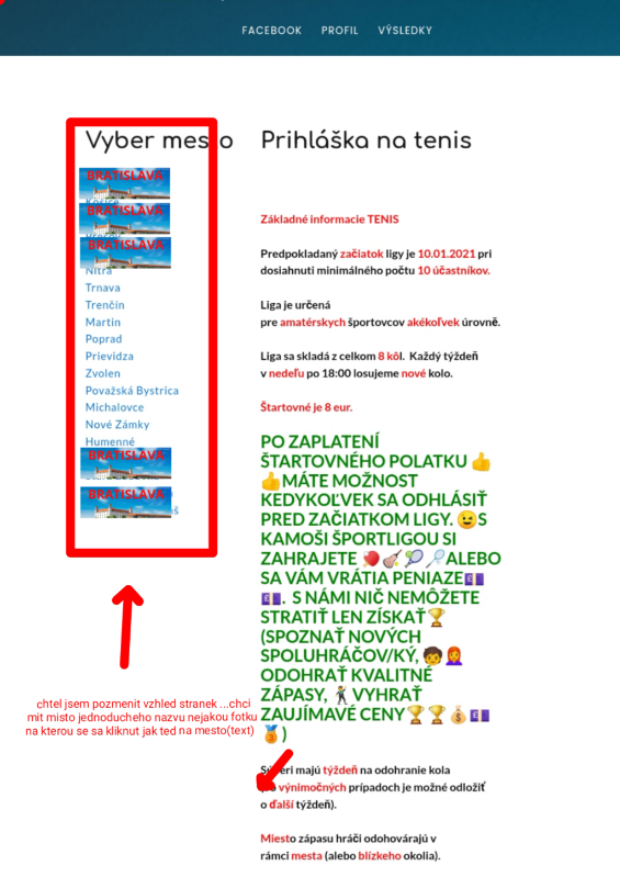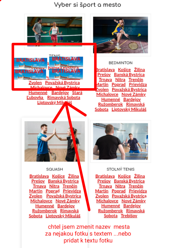 Dobrý den, posílám v příloze 2 fotky jak si představuji nahradit doterajší název města za nějakou fotku na kterou se bude dát kliknúť jako doteď na města. Vysloveně jde jenom o změnu vzhledu. Kdyby to bylo možný tak bych poprosil nějaký postup podle kterého bych to udělal sám na ostatní města.