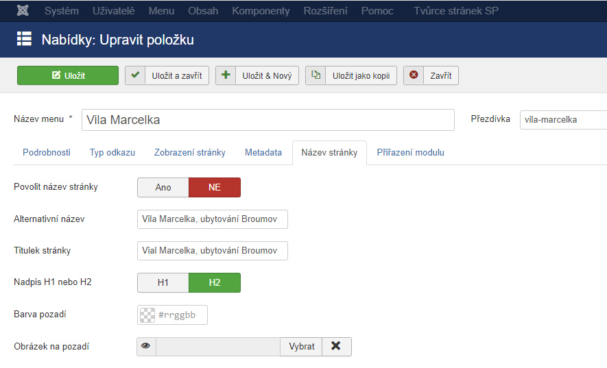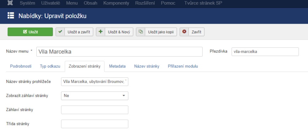 Titulek okna prohlížeče - Volitelný text, který bude použit jako titulek stránky prohlížeče. Ponecháte-li prázdné, bude jako titulek stránky prohlížeče použit název položky nabídky.