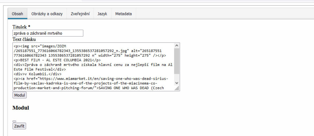 úpravy z veřejné části – „modul a nabídky“ ikonka pro edit článku se zobrazí, ale po kliknutí se úpravy přesměrují do backendu.