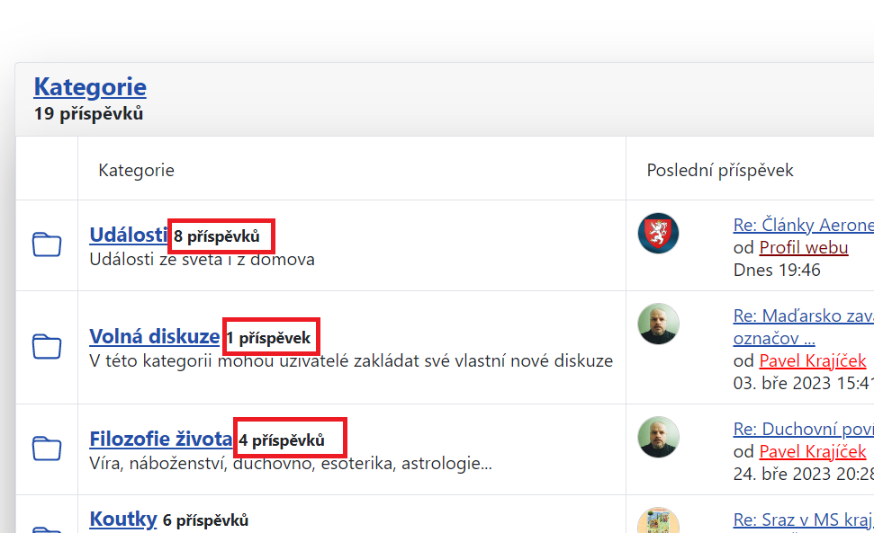 Měl bych na pana Bonga dotaz, zda je v jeho moci s tím něco udělat. Ve fóru Kunena máme dvě položky a sice Přehled kategorií a Přehled posledních témat. Vpravo se pak vždy nachází položka Poslední příspěvek. K položce Poslední témata nemám výhrad, ale položka Kategorie tam je u každé kategorie napsáno kolik daná kategorie obsahuje témat/jednotlivých diskuzí. A tady je problém, namísto aby tam stálo (počet) diskuzí nebo témat, tak tam je počet příspěvků viz obrázek v příloze. Což je zase zavádějící, není to pravda. Viz na obrázku u první kategorie s názvem Události to píše, že tam je 8 příspěvků, což není pravda. Celkem je v dané kategorii kolem 100 příspěvků. Osm je tam jen jednotlivých diskuzí. Nešlo by to nějak změnit, aby to ukazovalo třeba 8 diskuzí nebo 8 témat či tak nějak? Ovšem aby se to nehádalo potom s položkou Poslední témata nebo s modulem zobrazující poslední příspěvky. Myslím, že jsem něco zkoušel kdysi sám změnit v překladu a změna se zobrazila na více místech i tam kde nebyla žádoucí.