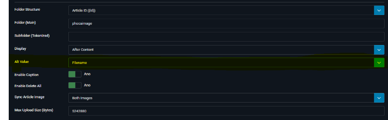 A hned tu mám nefunkčnost. "Alt value" se mě nepodařilo rozchodit, ať vyberu jakoukoli kombinaci, tak se žádný název souboru, titulek článku, atd ... do popisků obrázků galerie nevloží, tedy jen ten, co tam vložím ručně.