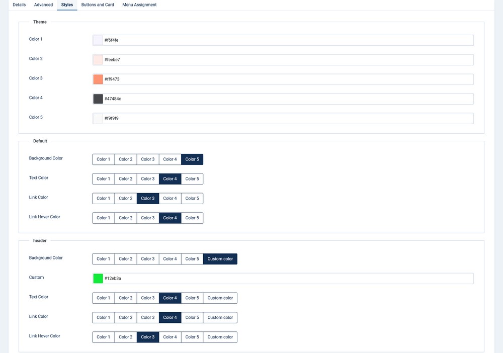 Dále můžete nastavit barevná schémata pro moduly (Card) a tlačítka (Primary a Secondary).