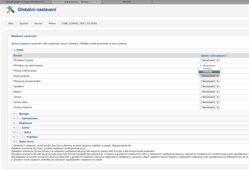Nastavení joomly v administraci v nastavení jednotlivych přístupu pro publik, registrovaní, admin, super admin.